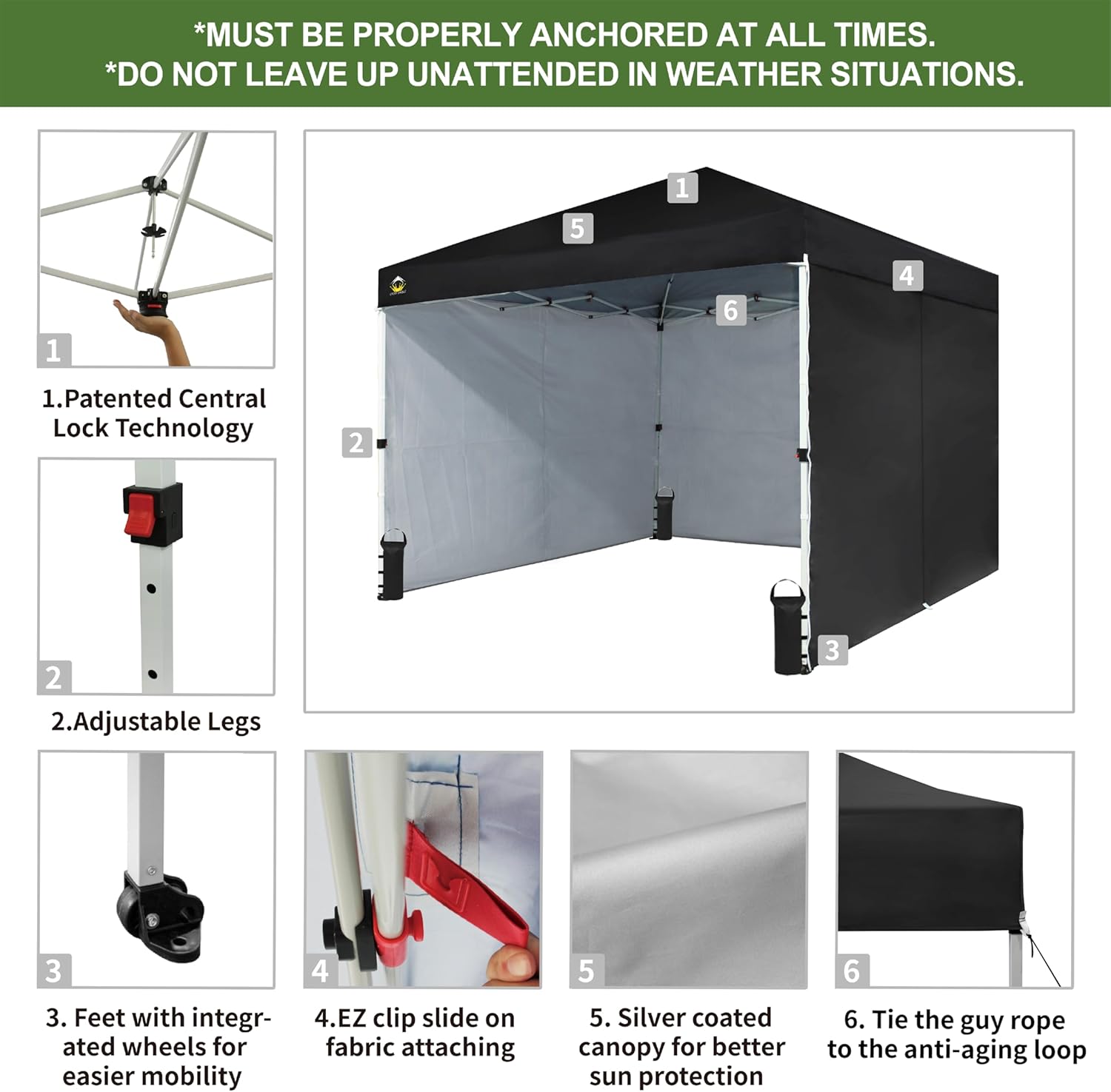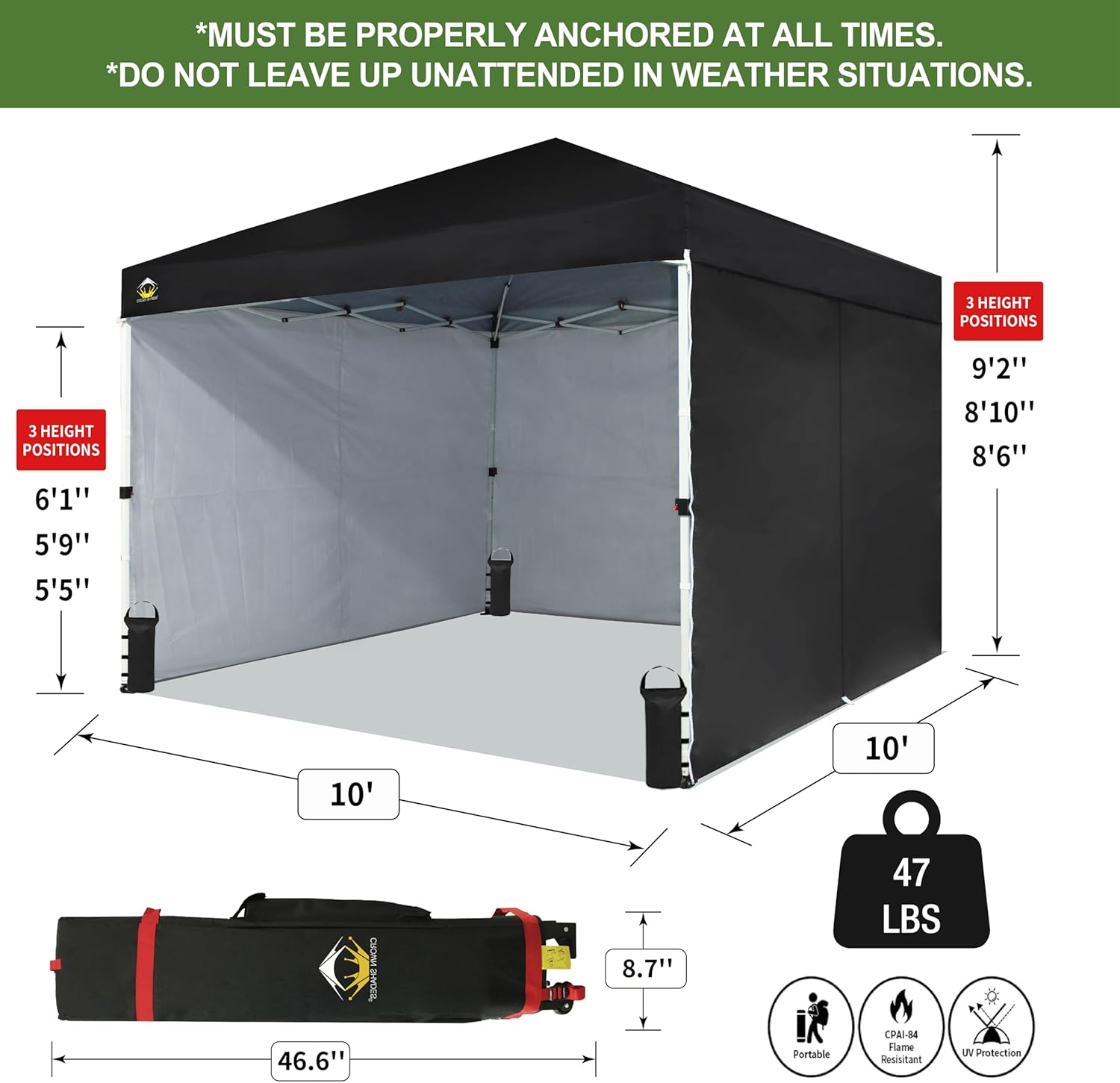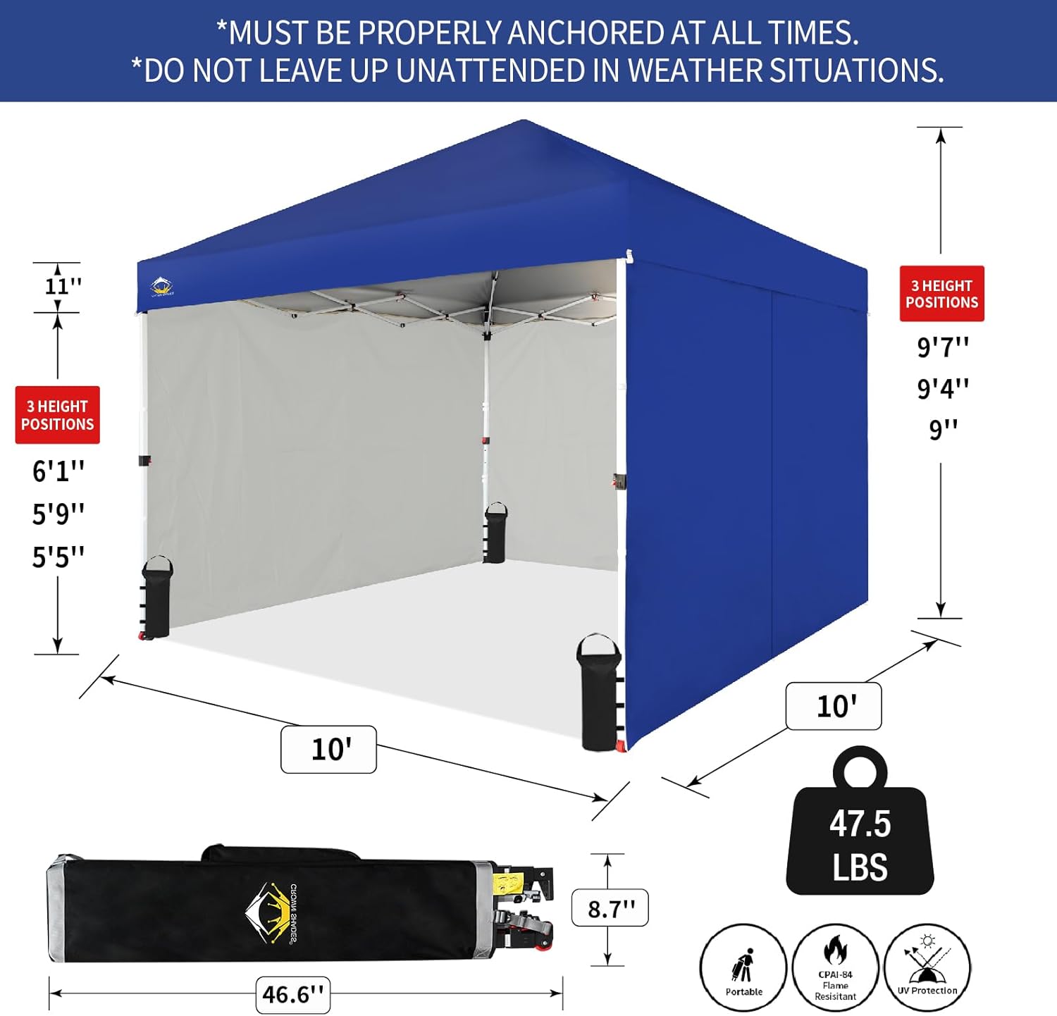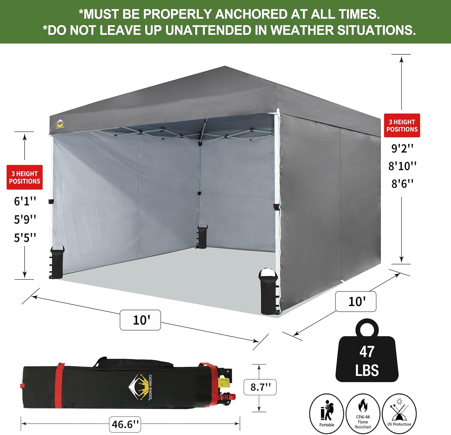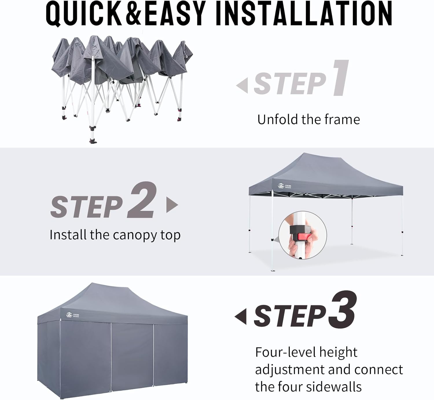 EFFORTLESS HEIGHT CUSTOMIZATION: With our pinch-free design, easily adjust the height of your pop-up tent canopy to three different levels. This feature allows for quick changes on the outdoor tent canopy, ensuring optimal functionality in any setting.