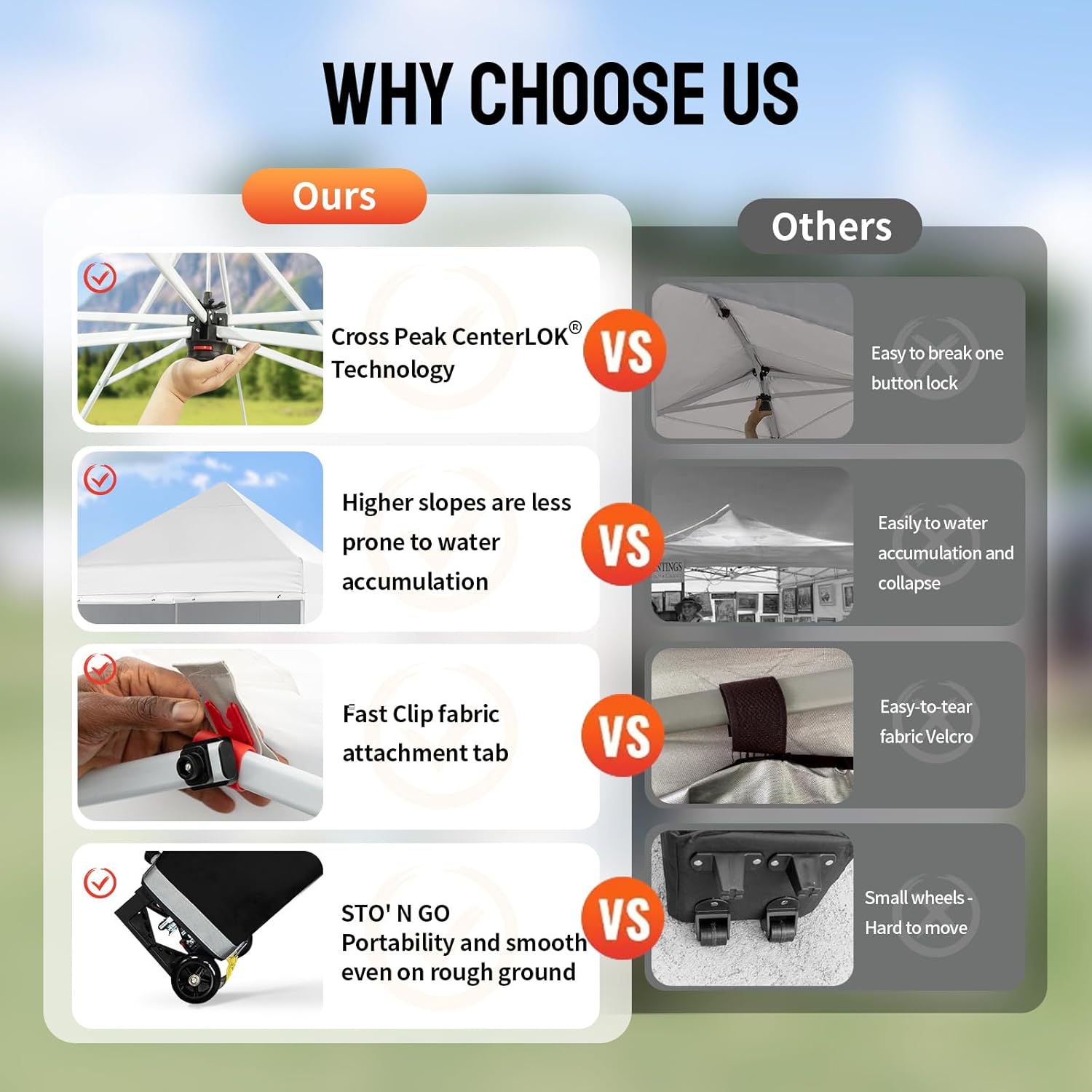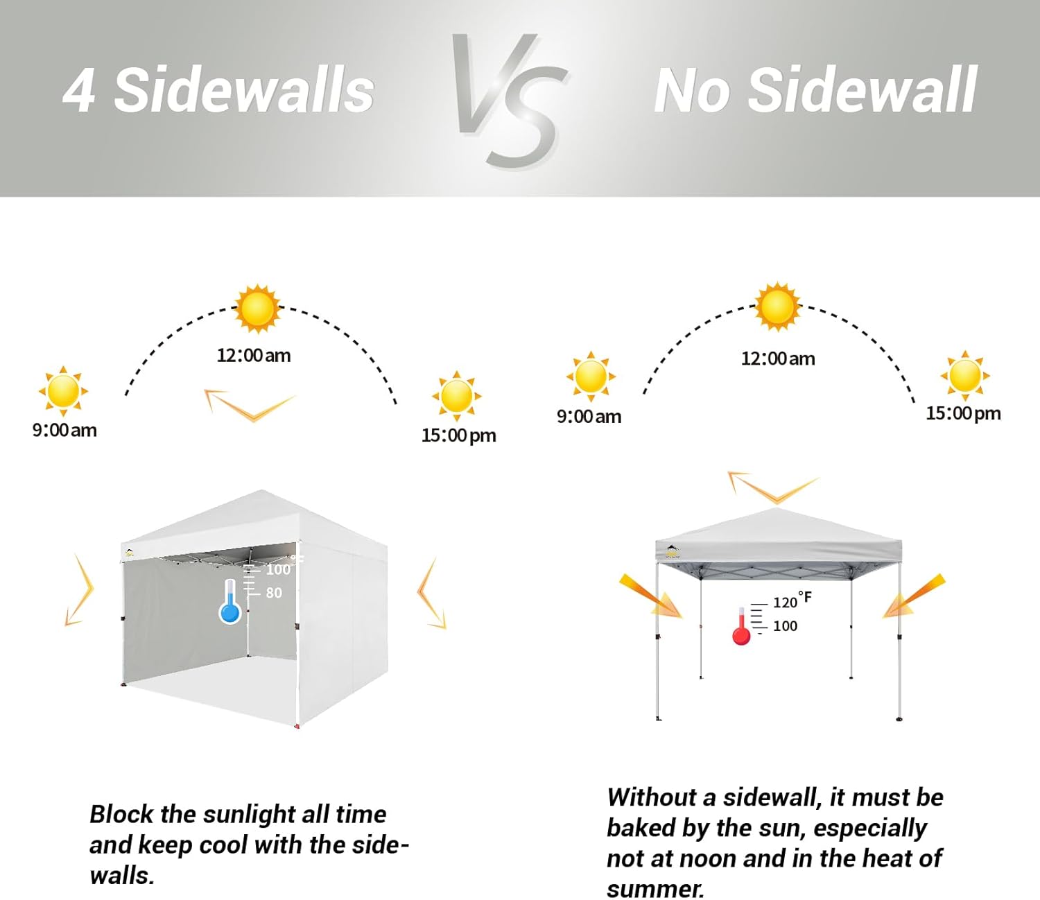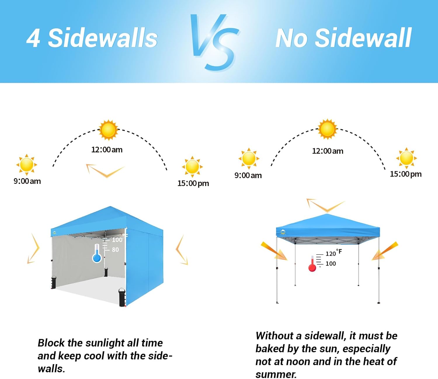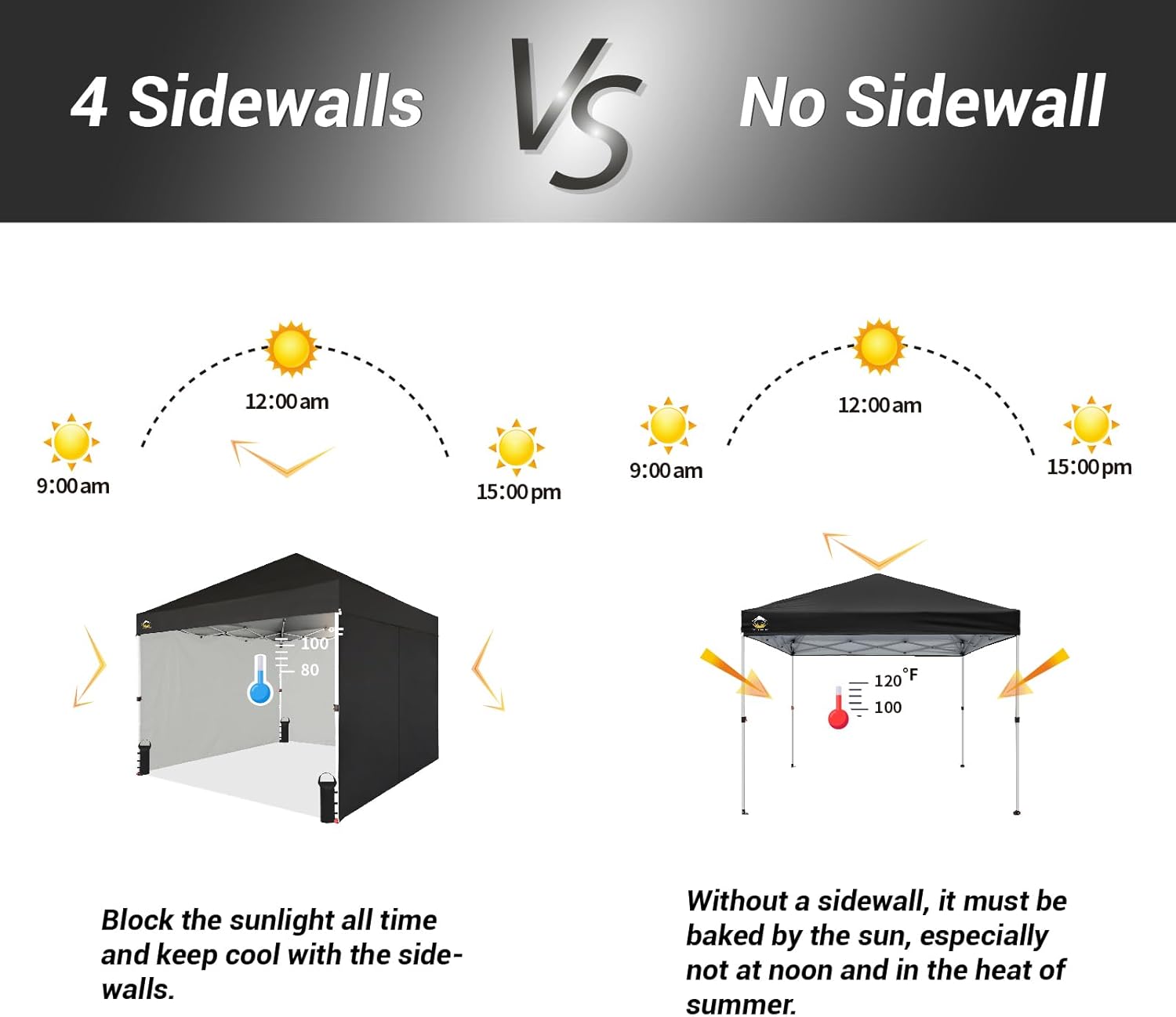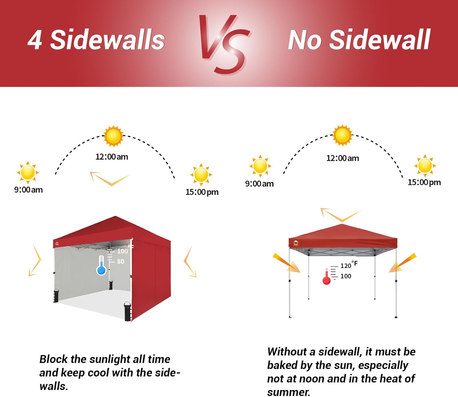 EFFORTLESS HEIGHT CUSTOMIZATION: With our pinch-free design, easily adjust the height of your pop-up tent canopy to three different levels. This feature allows for quick changes on the outdoor tent canopy, ensuring optimal functionality in any setting.