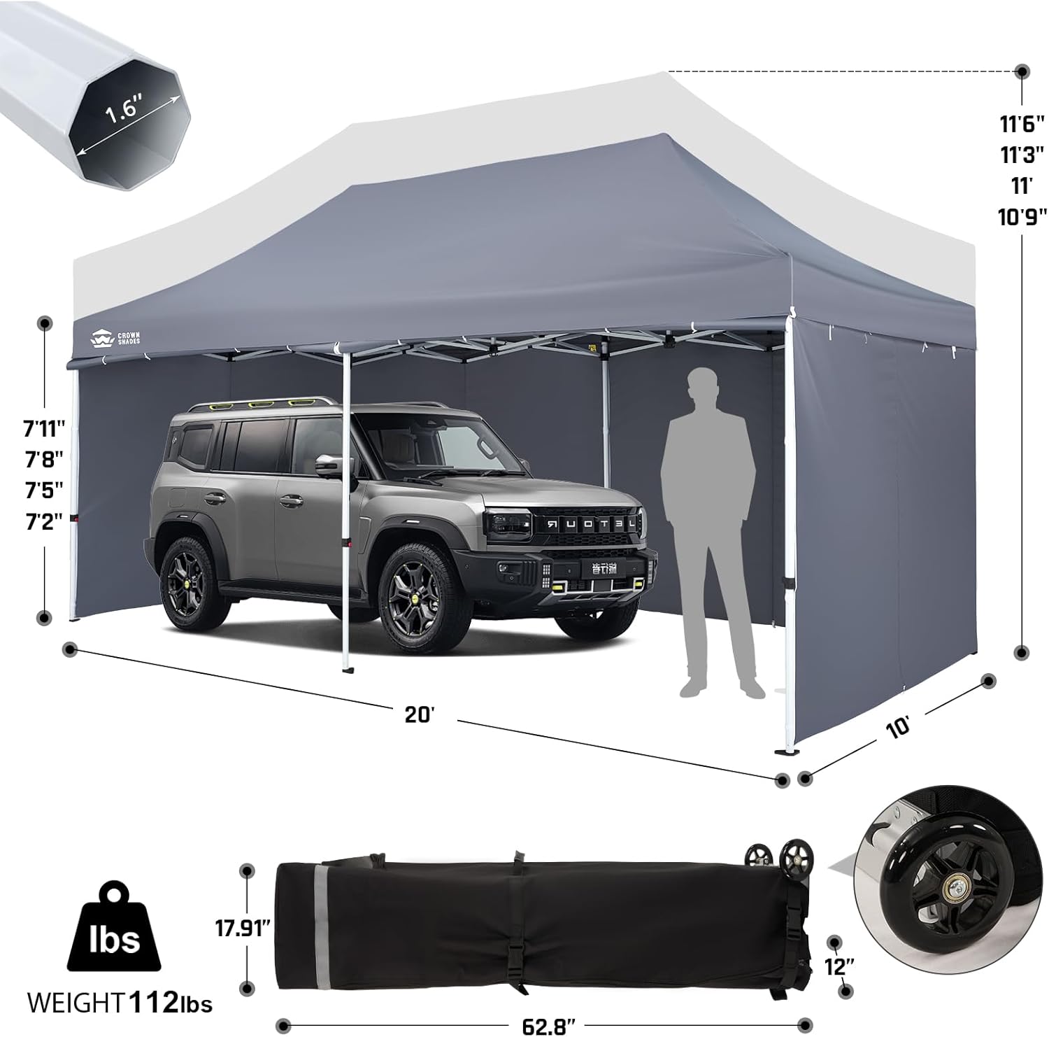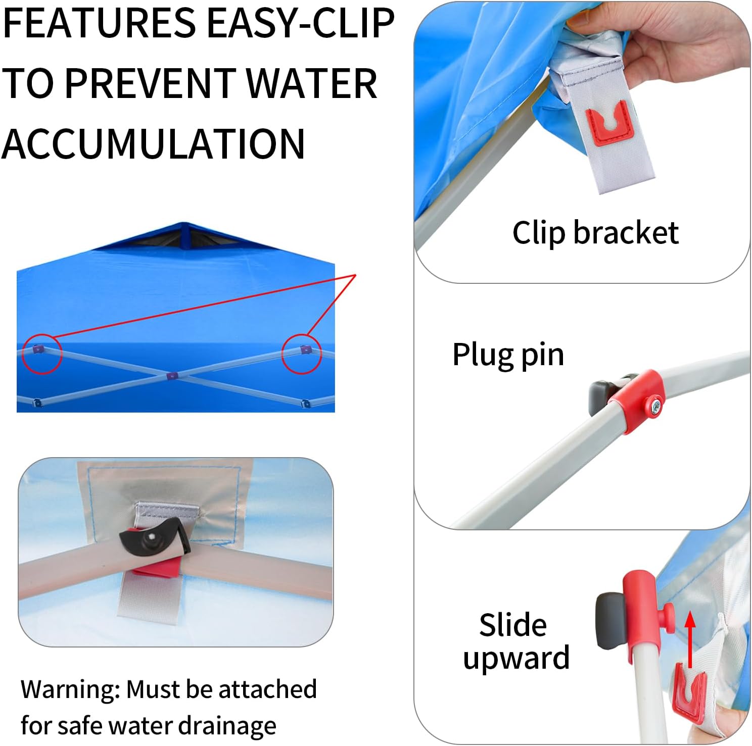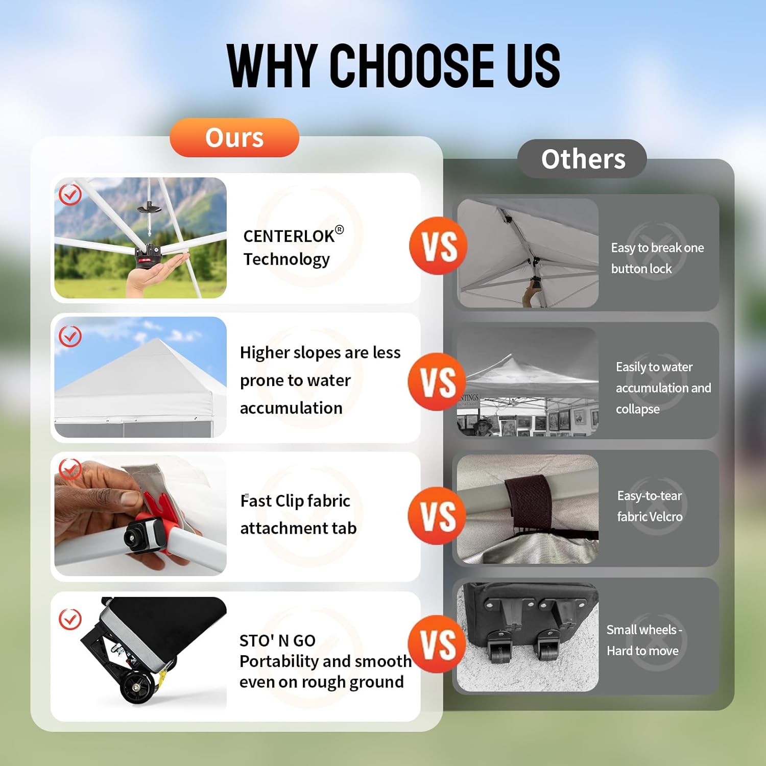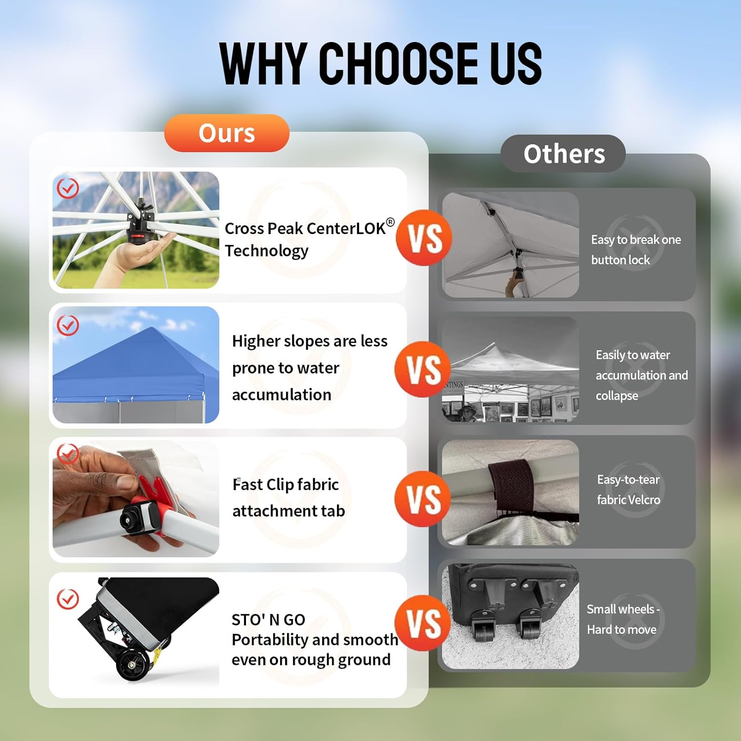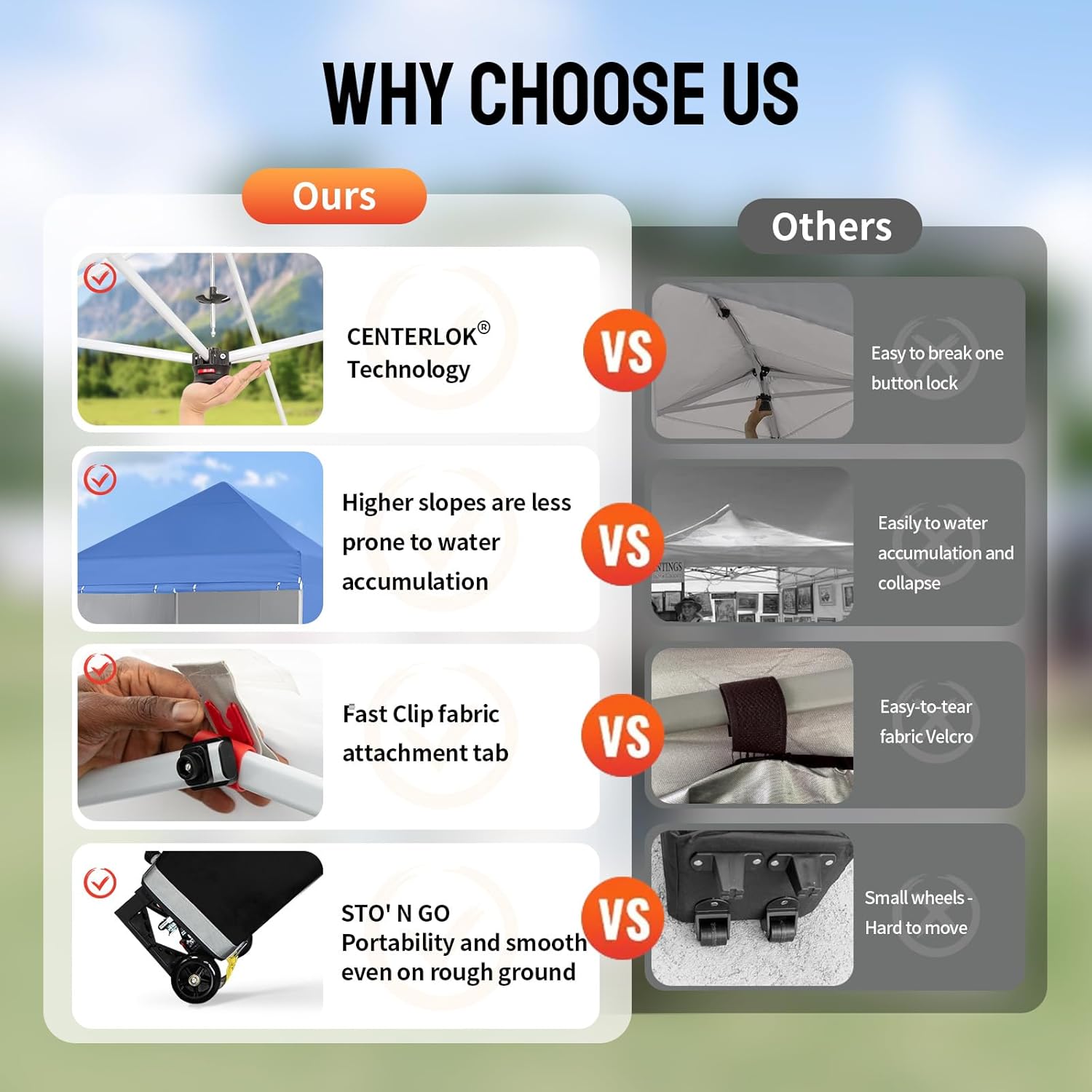 EFFORTLESS HEIGHT CUSTOMIZATION: With our pinch-free design, easily adjust the height of your pop-up tent canopy to three different levels. This feature allows for quick changes on the outdoor tent canopy, ensuring optimal functionality in any setting.