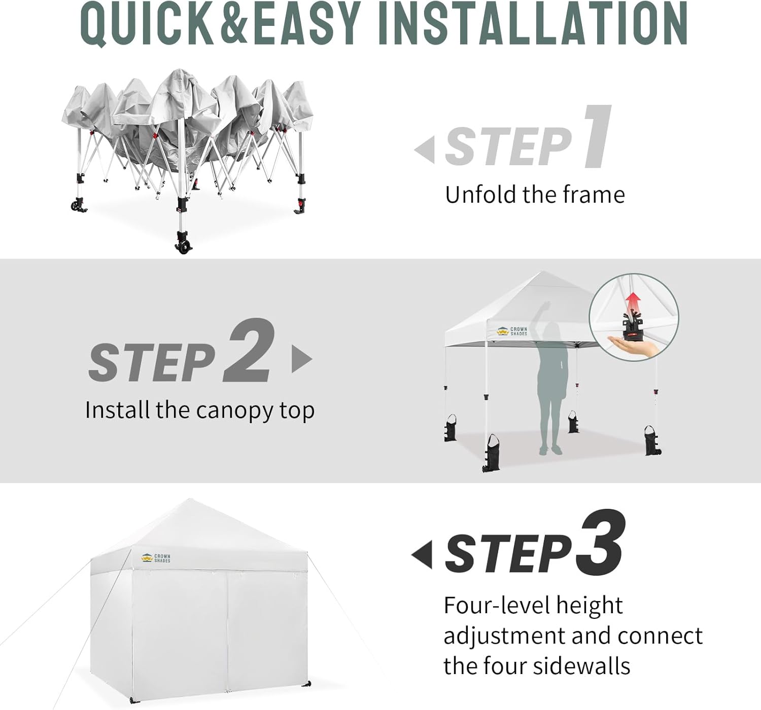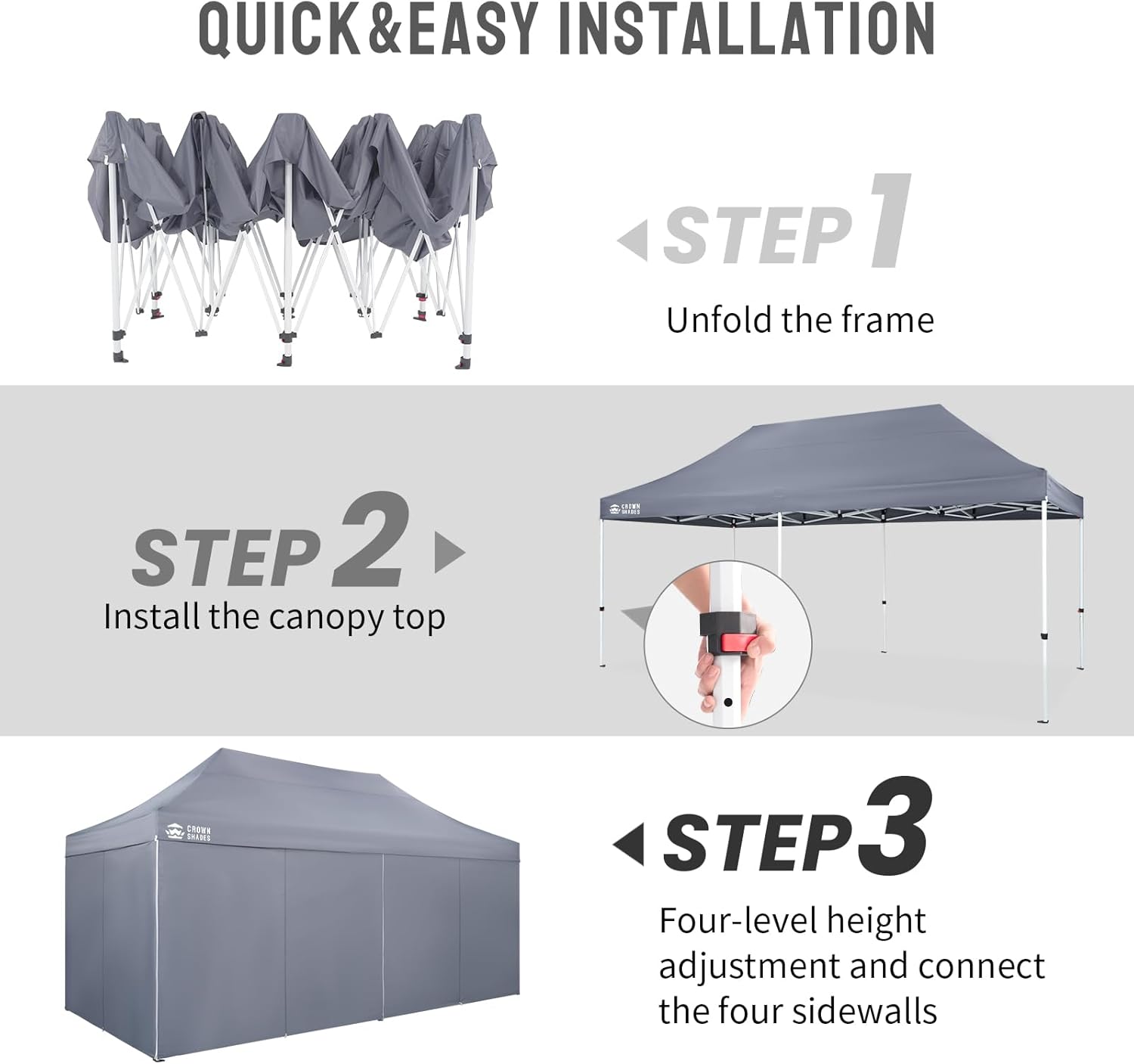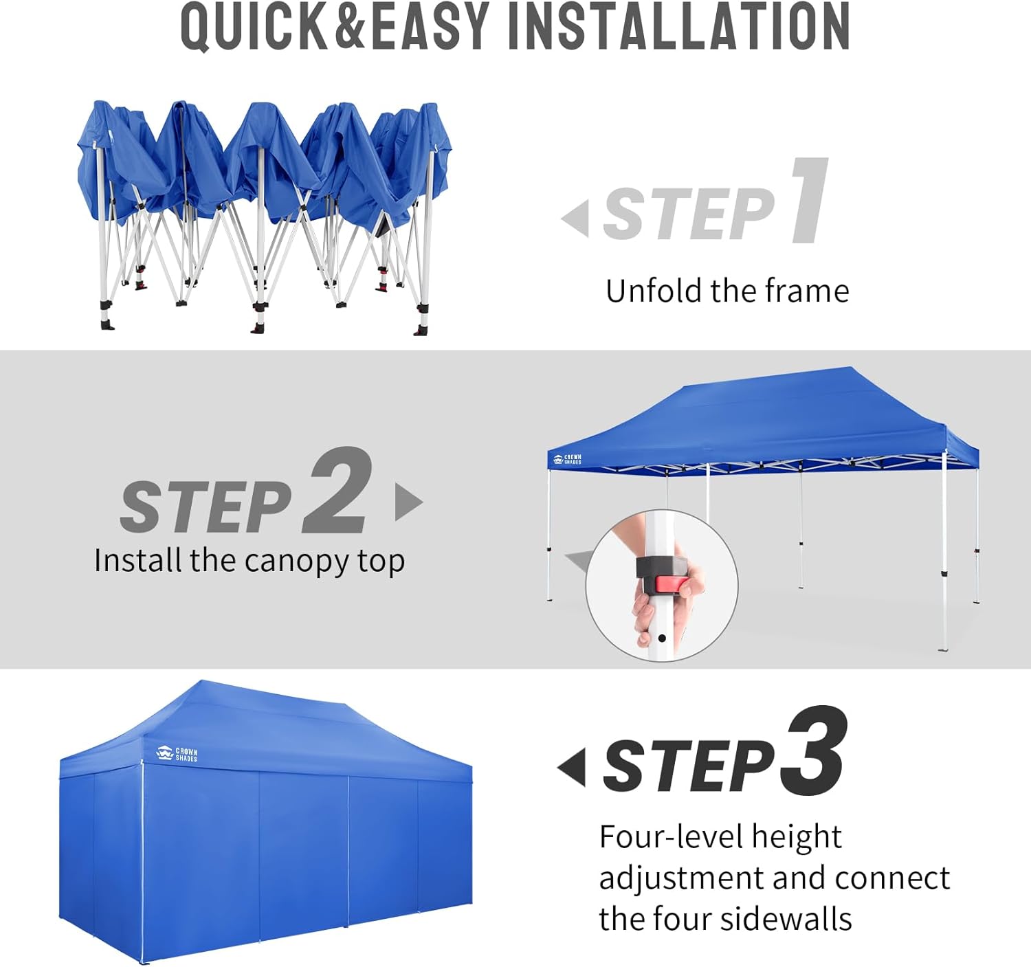 QUICK POP-UP INSTALLATION: The outdoor pop-up canopy can be deployed in under five minutes. Simply extend the frame, secure the top cover of your easy-up canopy tent, adjust the height as necessary, and finalize the setup with stakes and ropes.