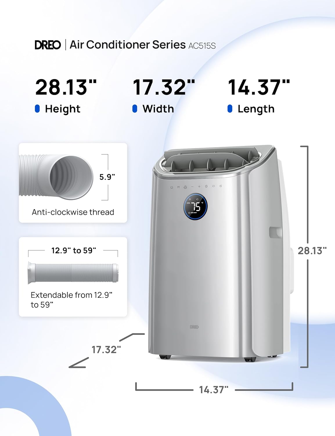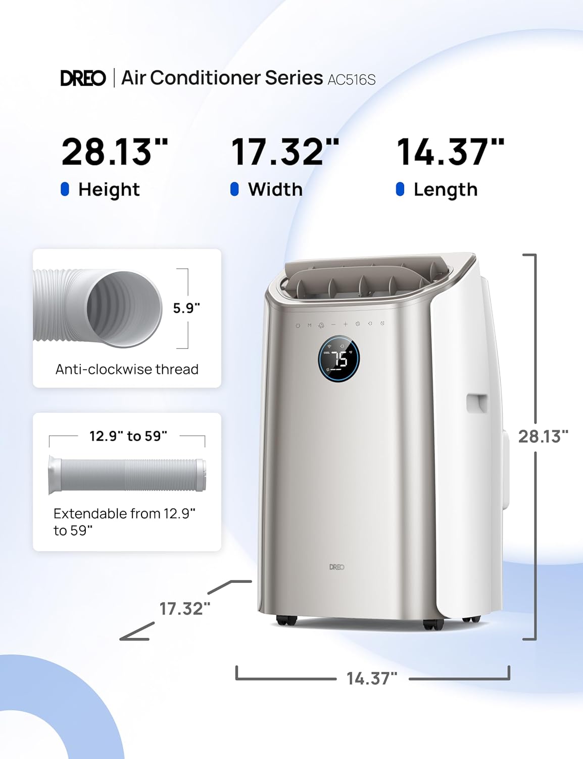 - 𝟭𝟰,𝟬𝟬𝟬 𝗕𝗧𝗨 (𝗔𝗦𝗛𝗥𝗔𝗘) 𝗖𝗼𝗼𝗹𝗶𝗻𝗴 𝗣𝗼𝘄𝗲𝗿: DREO AC516S 14000 btu portable air conditioners take cooling to spaces up to 400 sq.ft. , its 16ft cooling reach makes it Ideal for bedroom, living rooms, home offices, or studios. Maintain your ideal comfort with adjustable cooling from 65℉ to 86℉.