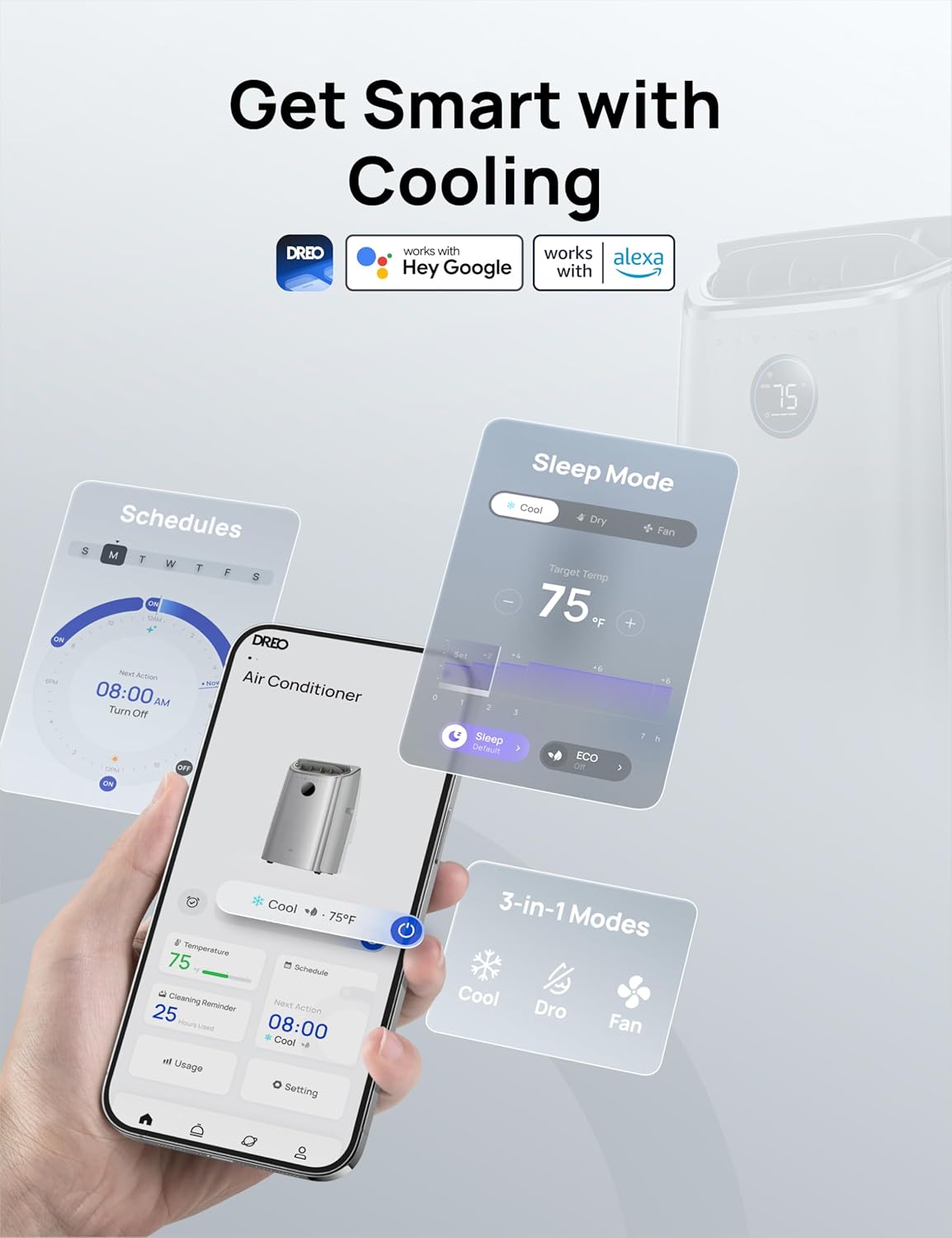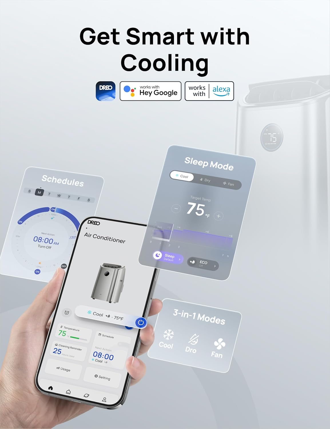 - 𝗩𝗼𝗶𝗰𝗲 & 𝗔𝗽𝗽-𝗘𝗻𝗮𝗯𝗹𝗲𝗱 𝗖𝗼𝗻𝘁𝗿𝗼𝗹: DREO AC516S seamlessly manage settings via Amazon Alexa, Google Home, or the DREO App. Adjust cooling modes, customize fan speeds (4 levels), program schedules, and monitor performance remotely from any location.