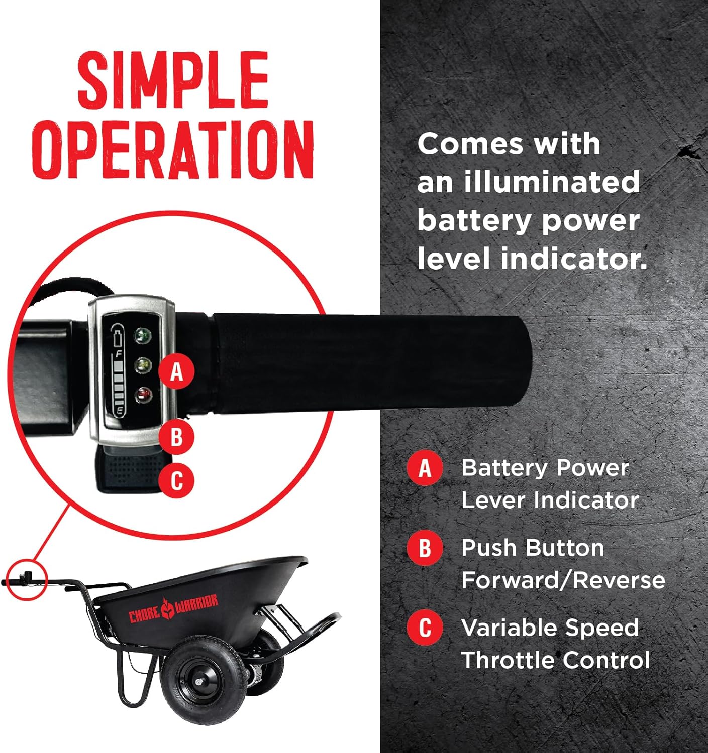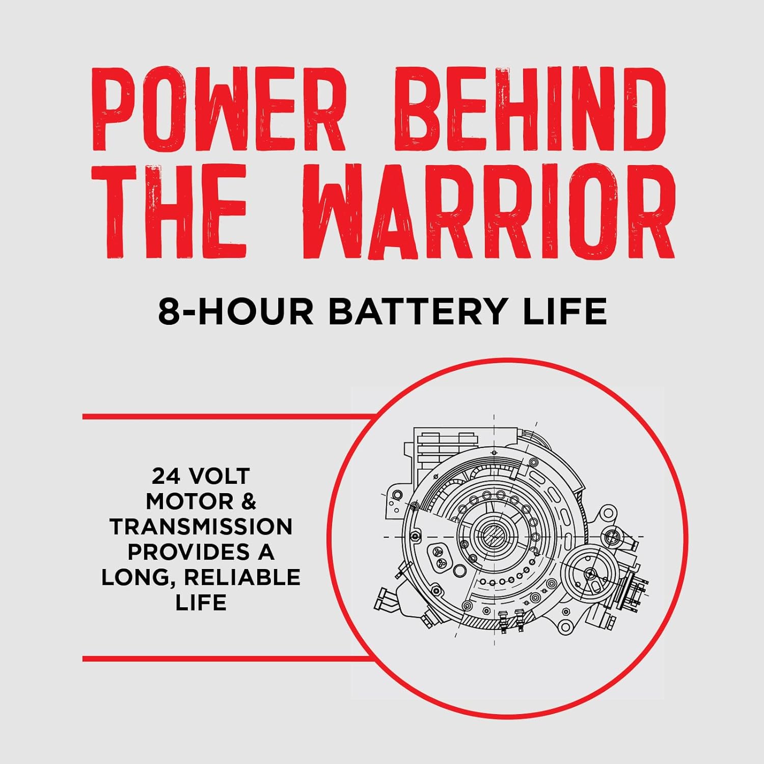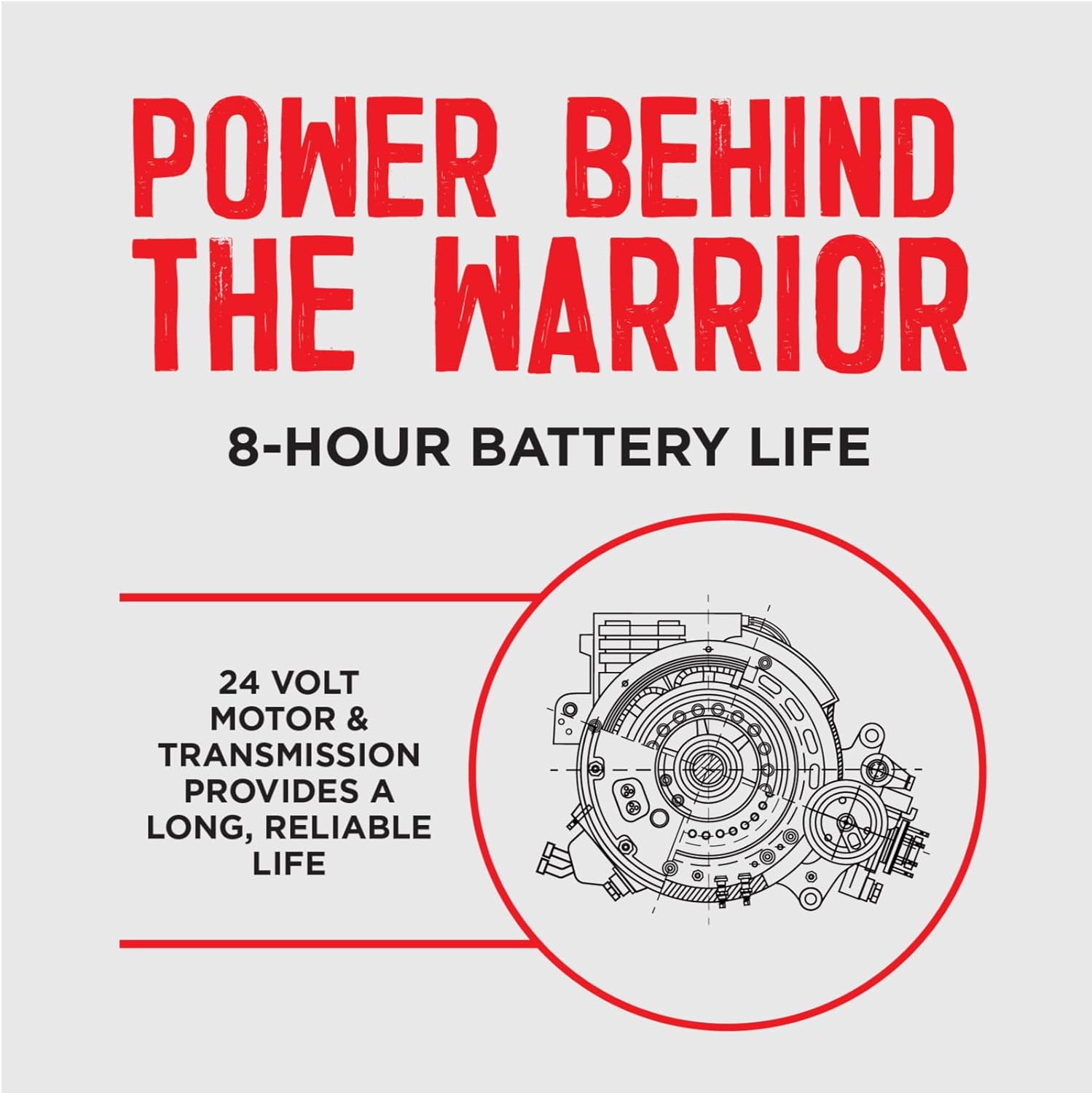 Battery: Powerful, 24-volt rechargeable battery-operated drive system. Comes with an illuminated battery power level indicator. Use a standard 120v AC outlet to charge. 2 sealed Acid Glass Mat 9Ah batteries.