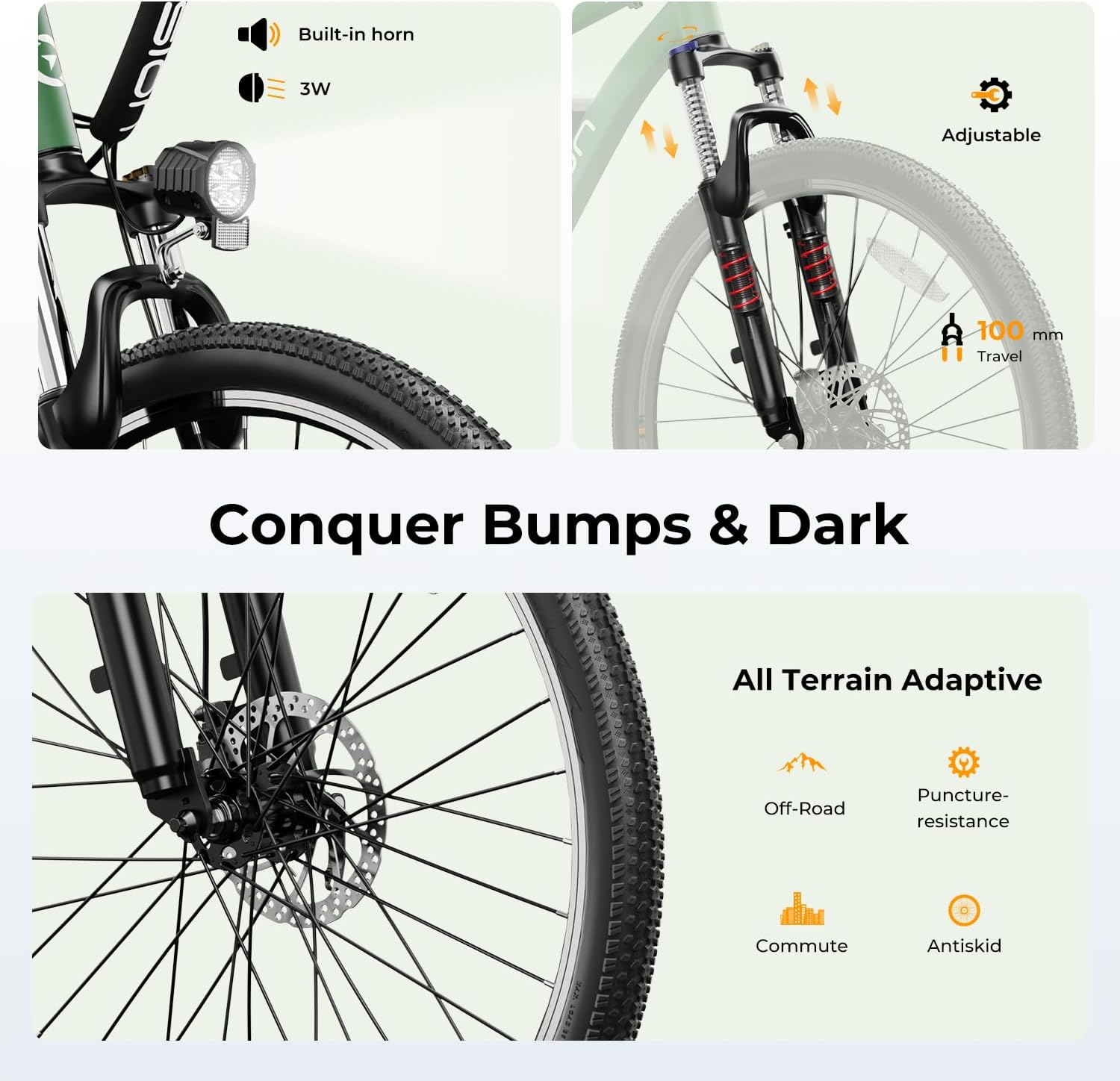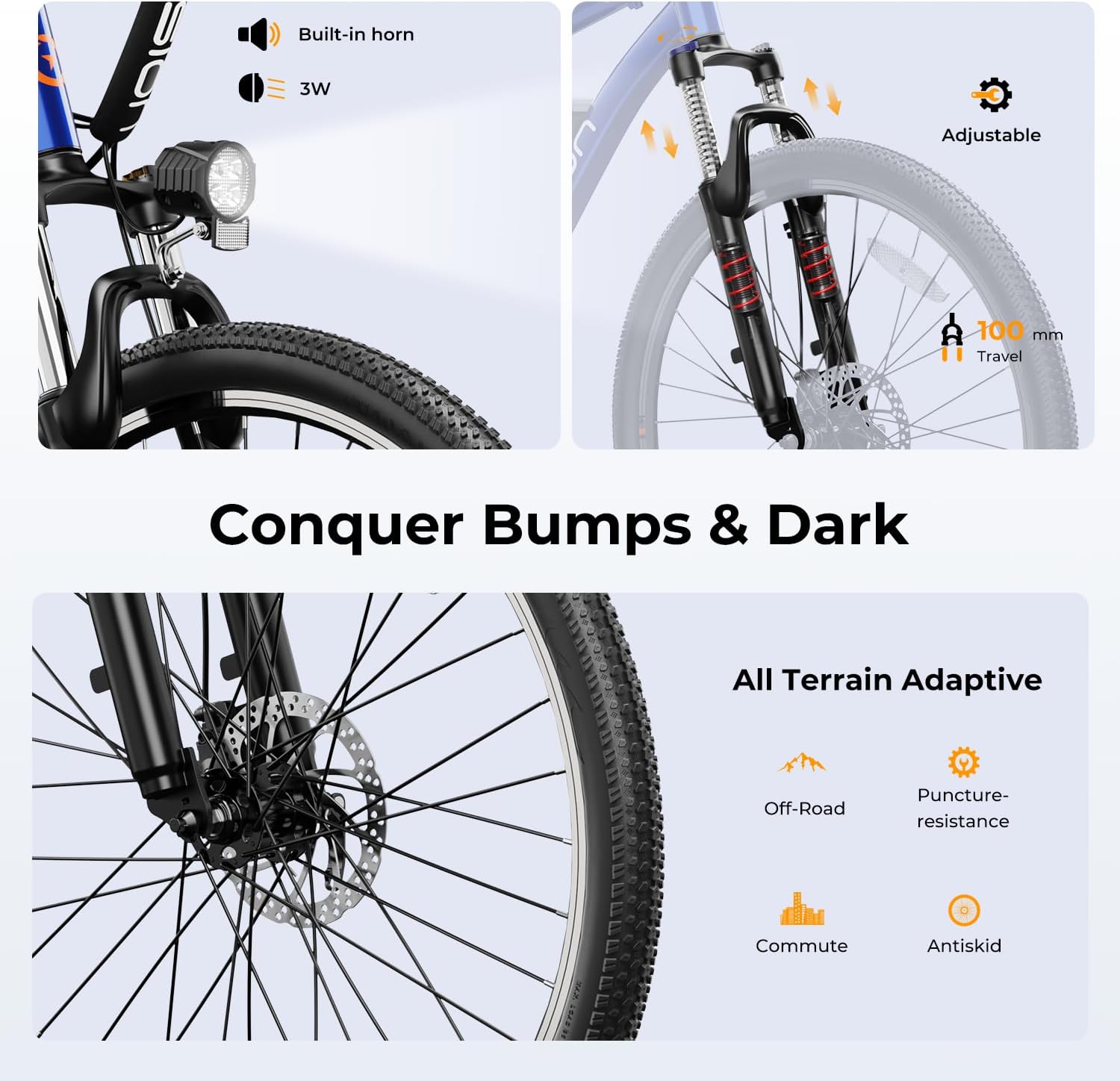 • Riding Comfortably and Handily: The 26" puncture resistant tires are for greater durability. A high-strength front fork suspension, 7-speed gears, dual lights, LCD display, front and rear mechanical disc brakes can bring your riding more comforts, make your e-bike adapted to complex terrains and keep you safe