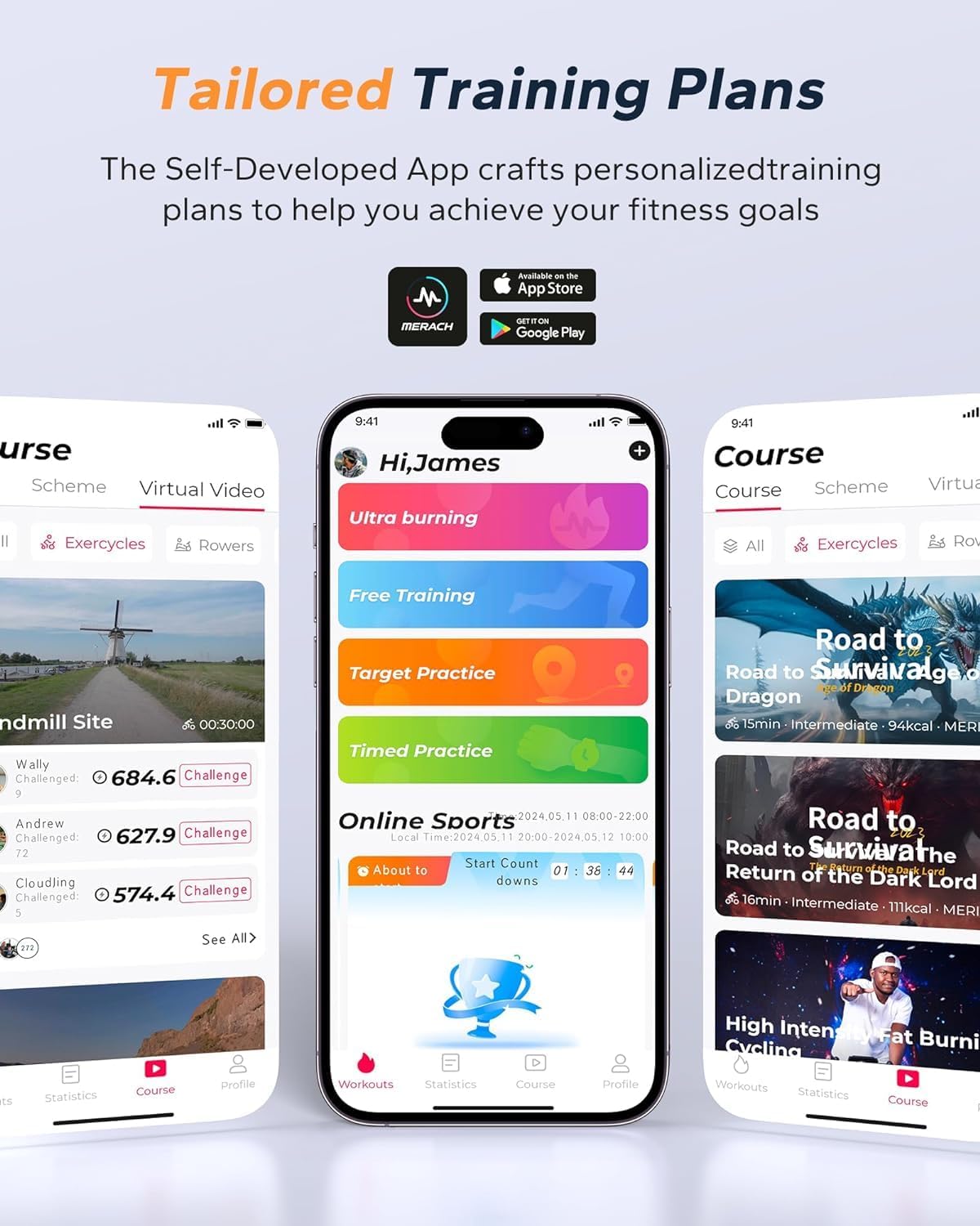 - WHY MERACH: We have self-developed MERACH APP, you will use it for free forever after the Exercise Bike and APP are bound! Our fitness trainers can work out with you online and give you professional guidance to increase your fat burning effect by 30%! A large number of real-life experience, simulation of crossing the Swiss snow, Alpine challenge, coastline riding and so on, make the boring exercise more interesting and exciting